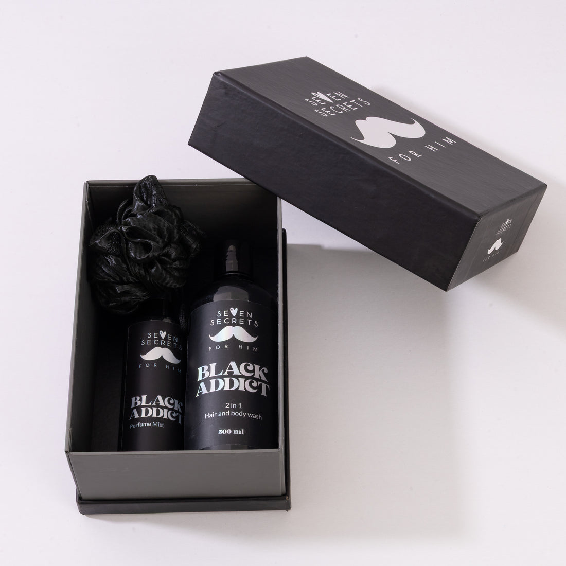 Fragrance :Β Amber, Sandalwood, and Patchouli Flower a complete set containing : Black Addict Hair...