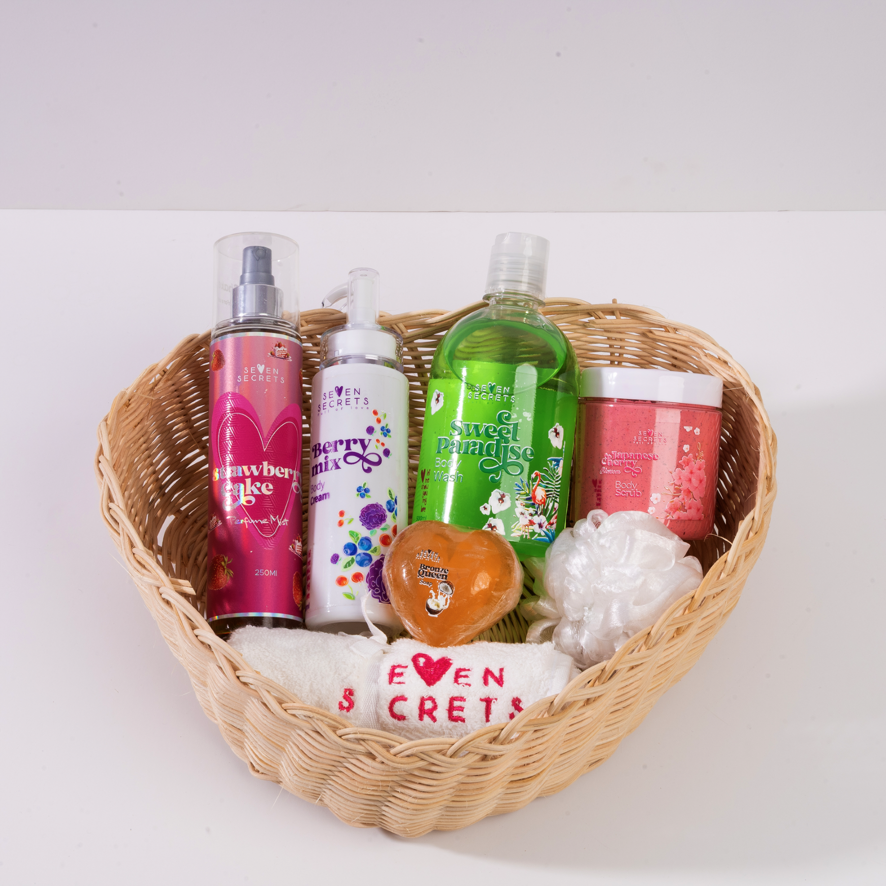 Perfume Mist 250mL + Scrub 300g + Body Cream 250mL + Body Wash 500mL + Soap + Sponge + Towel 30×30cm + Bamboo Basket