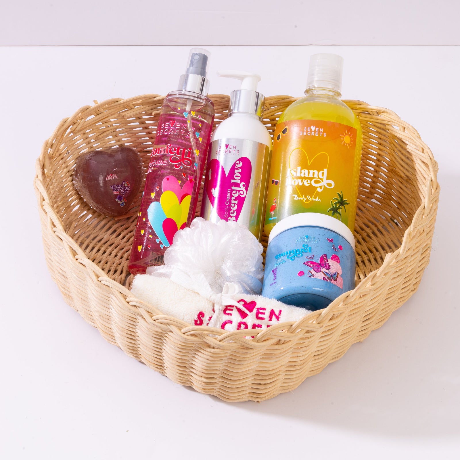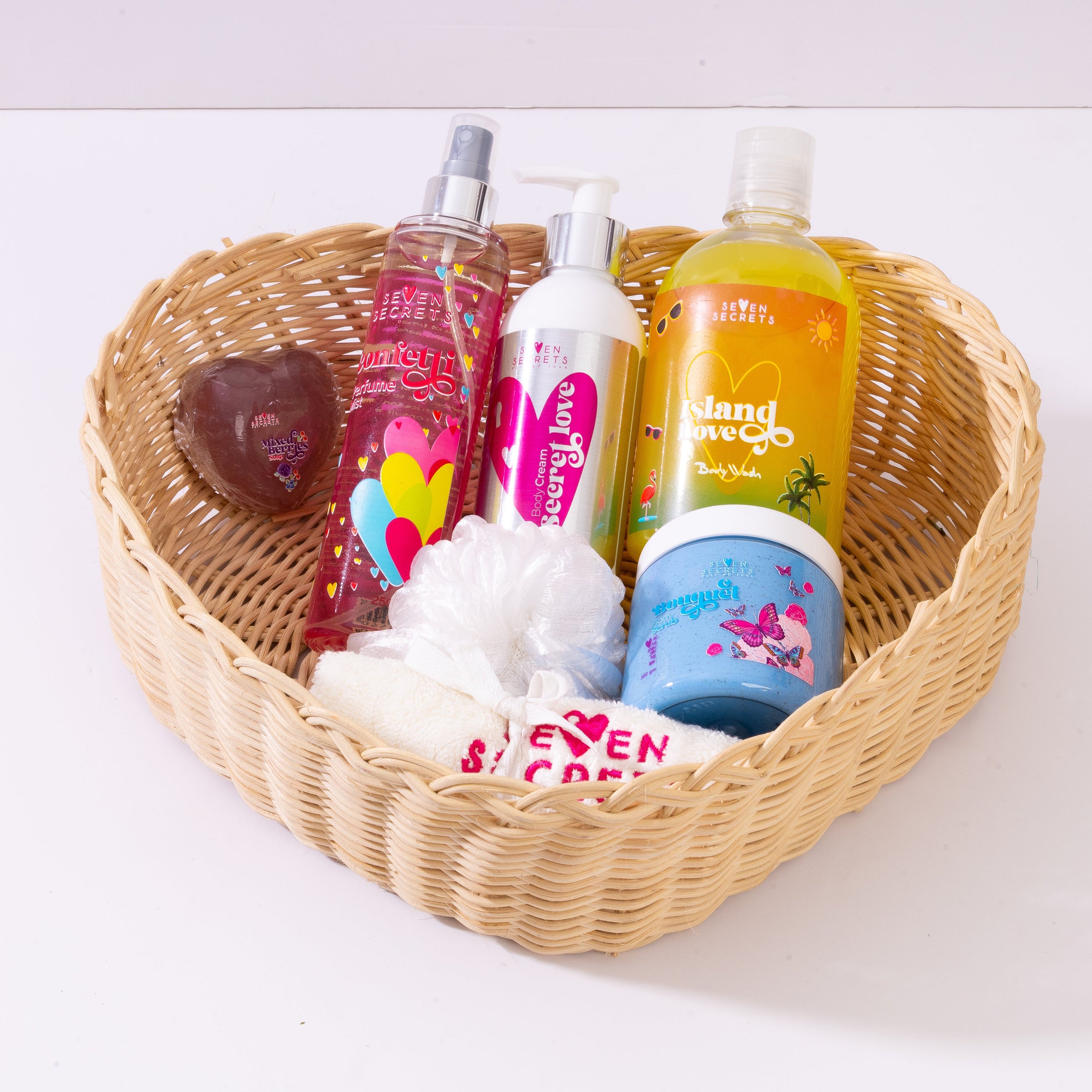 Perfume Mist 250mL + Scrub 300g + Body Cream 250mL + Body Wash 500mL + Soap + Sponge + Towel 30×30cm + Bamboo Basket