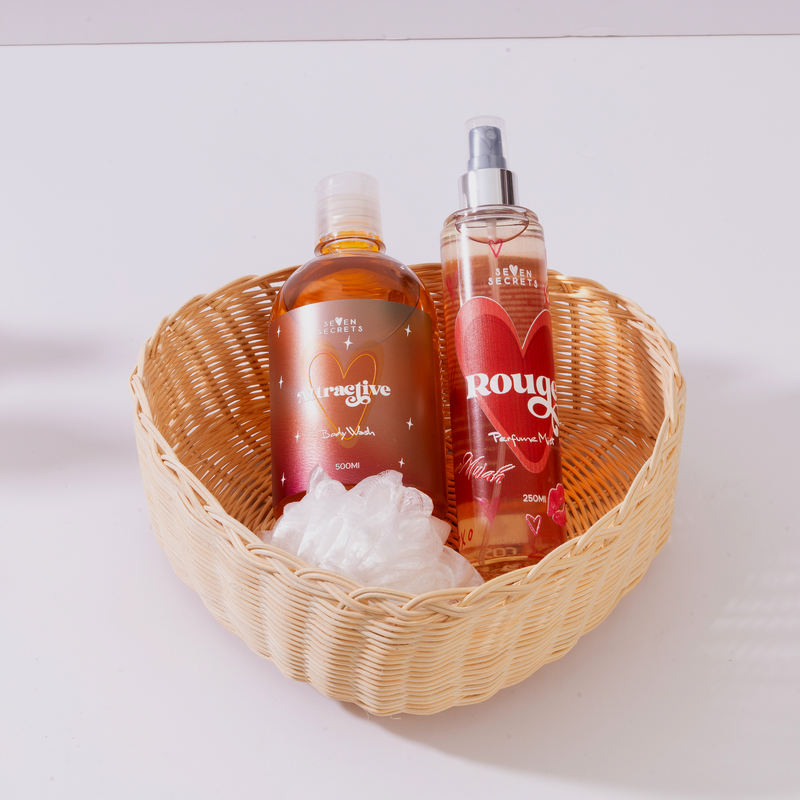 Perfume Mist 250mL + Body Wash 500mL + Sponge + Heart Bamboo Basket